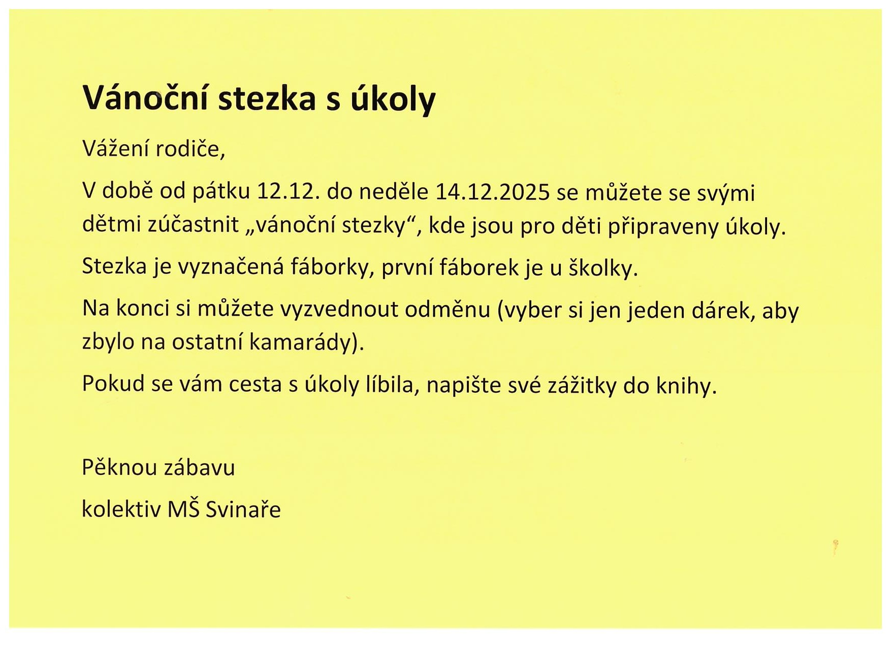 Mateřská škola bude v době vánočních prázdnin uzavřena od 22. 12. 2025 do 2. 1. 2026 včetně z provozních důvodů. Opět otevřeno bude od pondělí 5. 1. 2026. Děkujeme za pochopení.